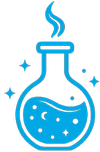 A blue illustration of a potion or chemical experiment bottle with steam and sparkles.